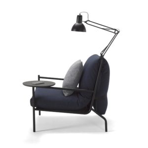 Noir, realizzata in Danimarca da Innovation, è una poltrona ideata e disegnata per i piccoli spazi. Dispone di una lampada ed un tavolino con carica batterie wireless per cellulari integrati. La seduta e lo schienalesono costituiti da un comodo materasso da 70×200 cm, che può essere sfilato ed utilizzato comeletto. Le gambe e la struttura sono realizzate in acciaio nero.